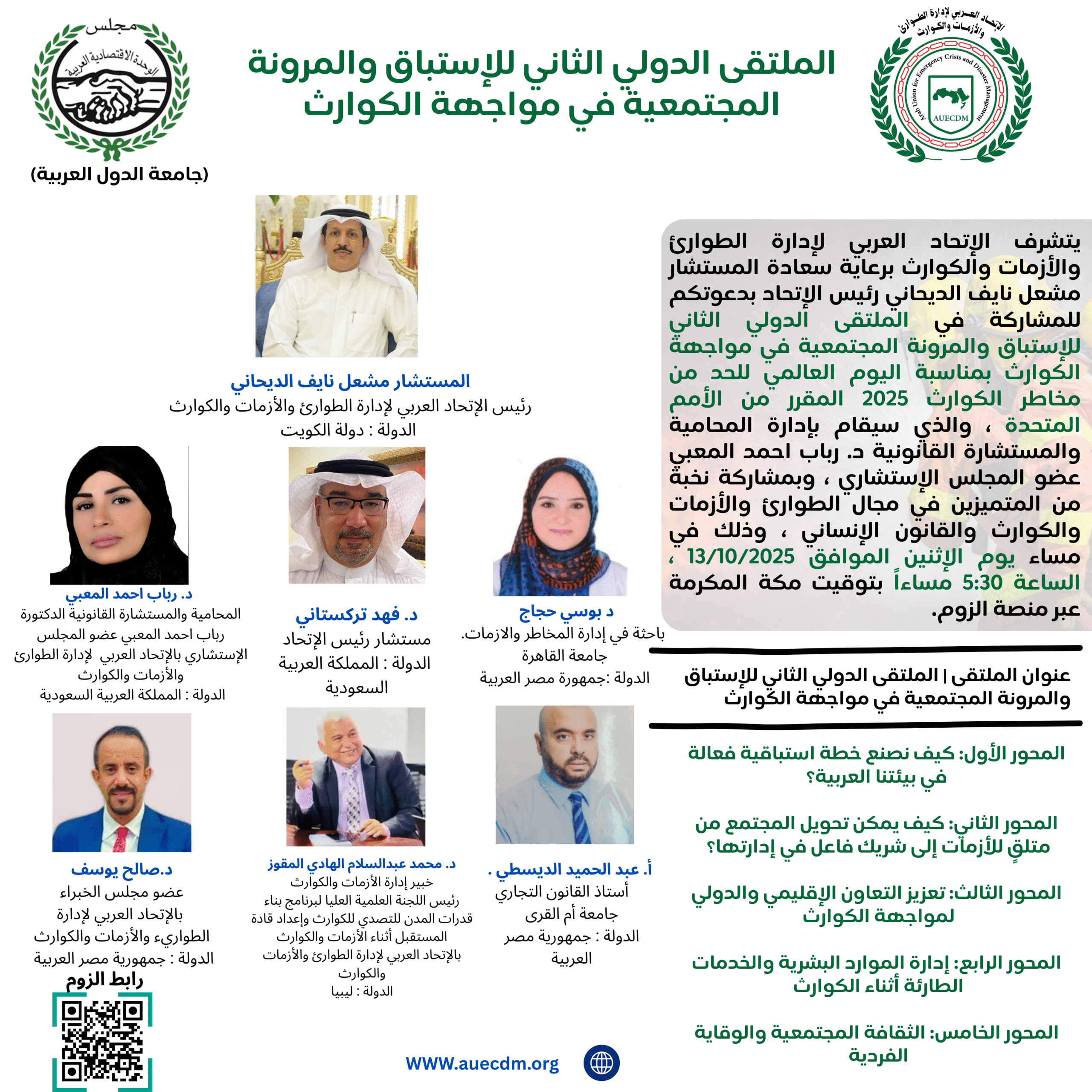 ينظم الإتحاد العربي لإدارة الطوارئ والأزمات والكوارث، برعاية المستشار مشعل نايف الديحاني، رئيس الإتحاد، الملتقى الدولي الثاني للإستباق والمرونة المجتمعية في مواجهة الكوارث، بمناسبة اليوم العالمي للحد من مخاطر الكوارث 2025 الذي أقرته الأمم المتحدة.