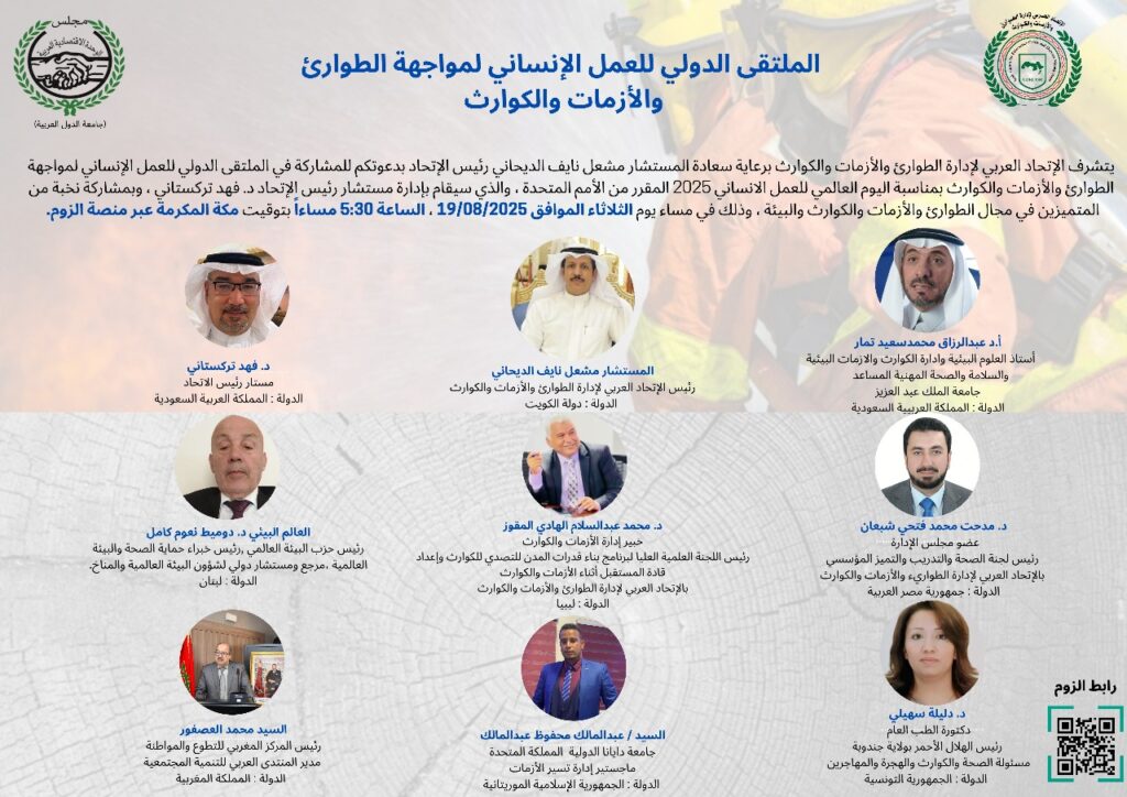 يقام غدا الثلاثاء “الملتقى الدولي للعمل الإنساني لمواجهة الطوارئ والأزمات والكوارث” والذي ينظمه الاتحاد العربي لإدارة الطوارئ والأزمات والكوارث، برعاية رئيس الاتحاد المستشار مشعل نايف الديحاني، وإدارة الدكتور فهد تركستاني، مستشار الرئيس، وذلك تزامنًا مع اليوم العالمي للعمل الإنساني 2025 الذي أقرّته الأمم المتحدة.